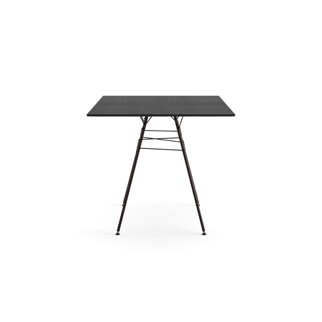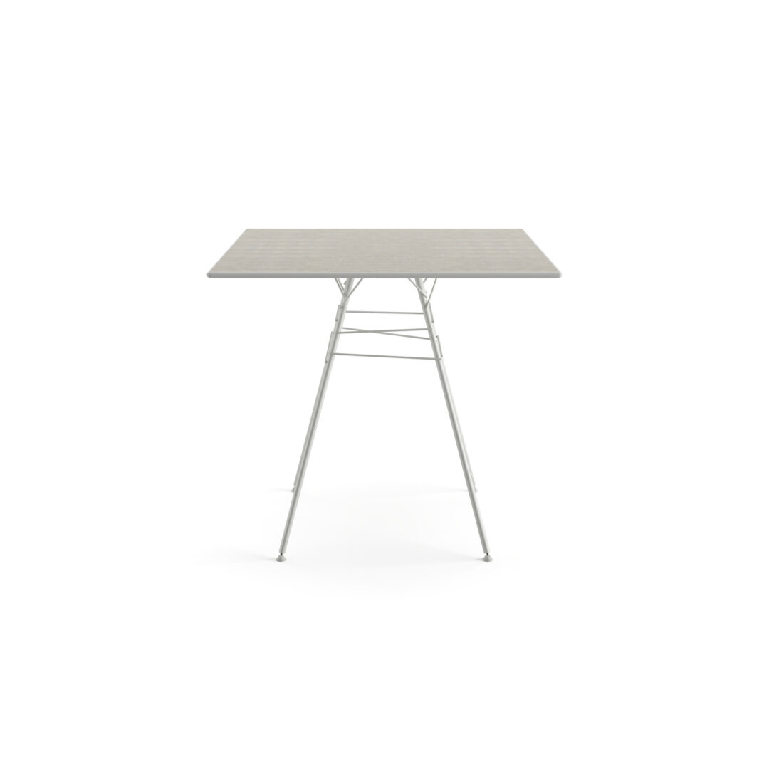 Tavolo con base 4 gambe in acciaio verniciato e piano quadrato 79 x 79 cm in HPL effetto pietra (spessore 1,2 cm), adatto all’utilizzo outdoor.