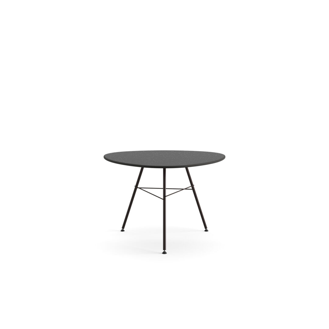 Tavolino con base 3 gambe in acciaio verniciato e piano di forma triangolare arrotondata Ø 79 cm in HPL effetto pietra (spessore 1,2 cm), adatto all’utilizzo outdoor.