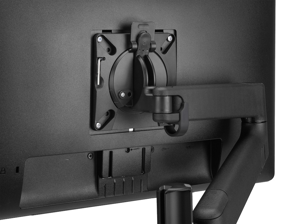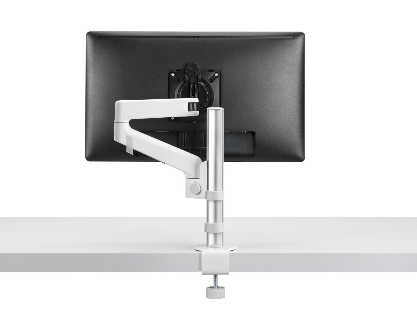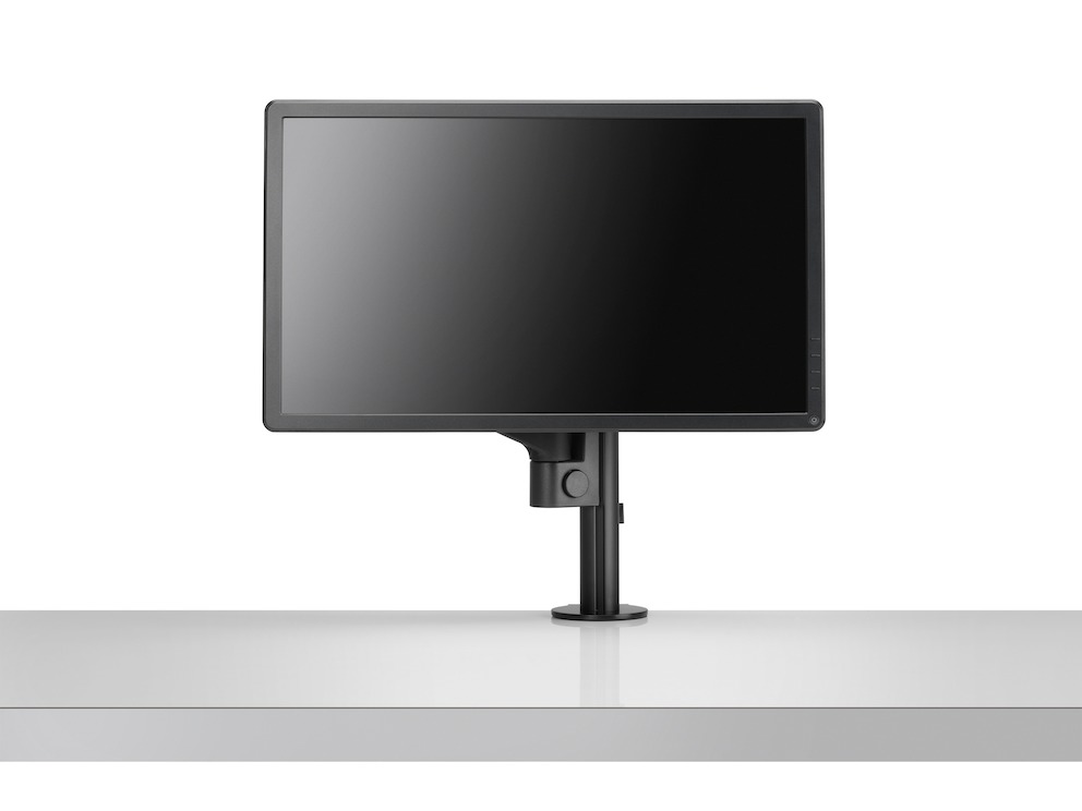 Braccio porta monitor singolo con portata massima di 6,5kg. Morsetto per aggancio a piani scrivania con spessore 6-40mm.