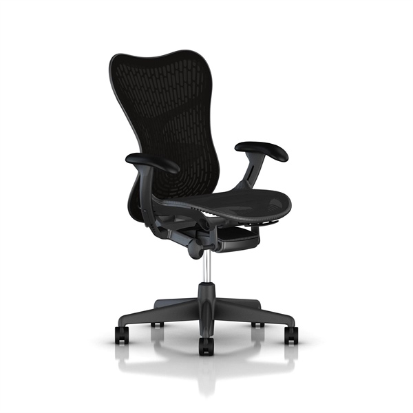 Versione con schienale in Triflex forato e flessibile e rivestito frontalmente in tessuto Butterfly in colore nero. Sedile realizzato in rete elastica AirWeave2, in colore Grafite.
